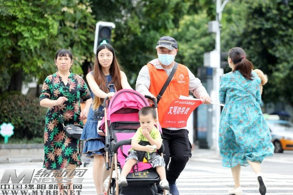 文明勸導(dǎo)員維護(hù)交通秩序(綿陽(yáng)日?qǐng)?bào)社融媒體記者陳冬冬攝)