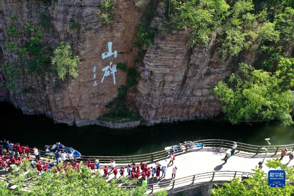 游客在河南林州紅旗渠畔參觀(2019年5月22日攝,無人機(jī)照片)。新華社記者 馮大鵬 攝