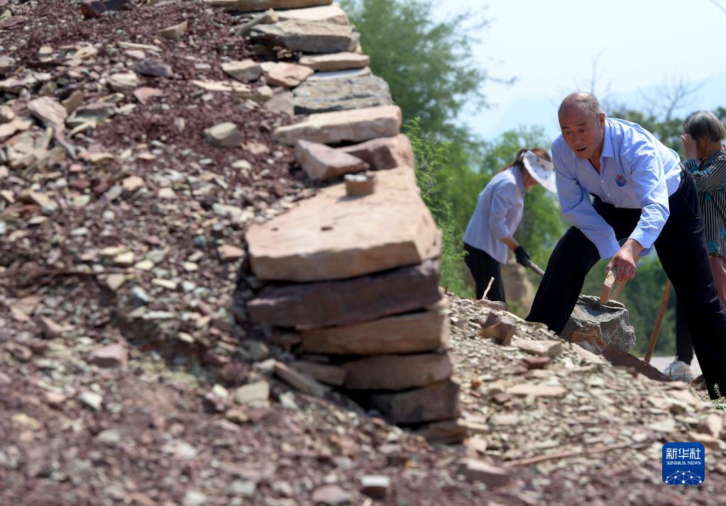 在林州市任村鎮(zhèn)盤龍山村,王生有(前)帶領(lǐng)村民清理亂石,維護(hù)道路(2019年7月3日攝)。新華社記者 李安 攝