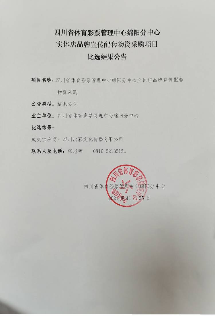 四川省體育彩票管理中心綿陽分中心實(shí)體店品牌宣傳配套物資采購項(xiàng)目比選結(jié)果公告