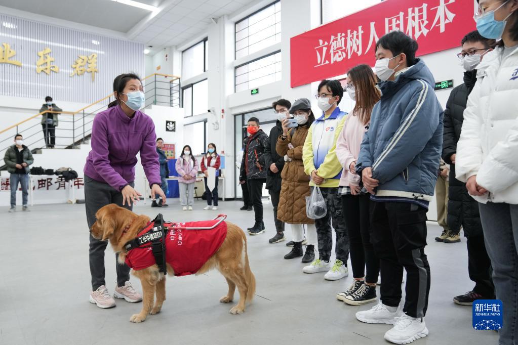 12月1日,在北京郵電大學,來自通州區(qū)第二醫(yī)院中醫(yī)科的張冉(前左)帶著自己的導盲犬沙果為參加培訓的志愿者介紹導盲犬的工作方式,讓志愿者了解如何為攜帶導盲犬的殘障人士服務。