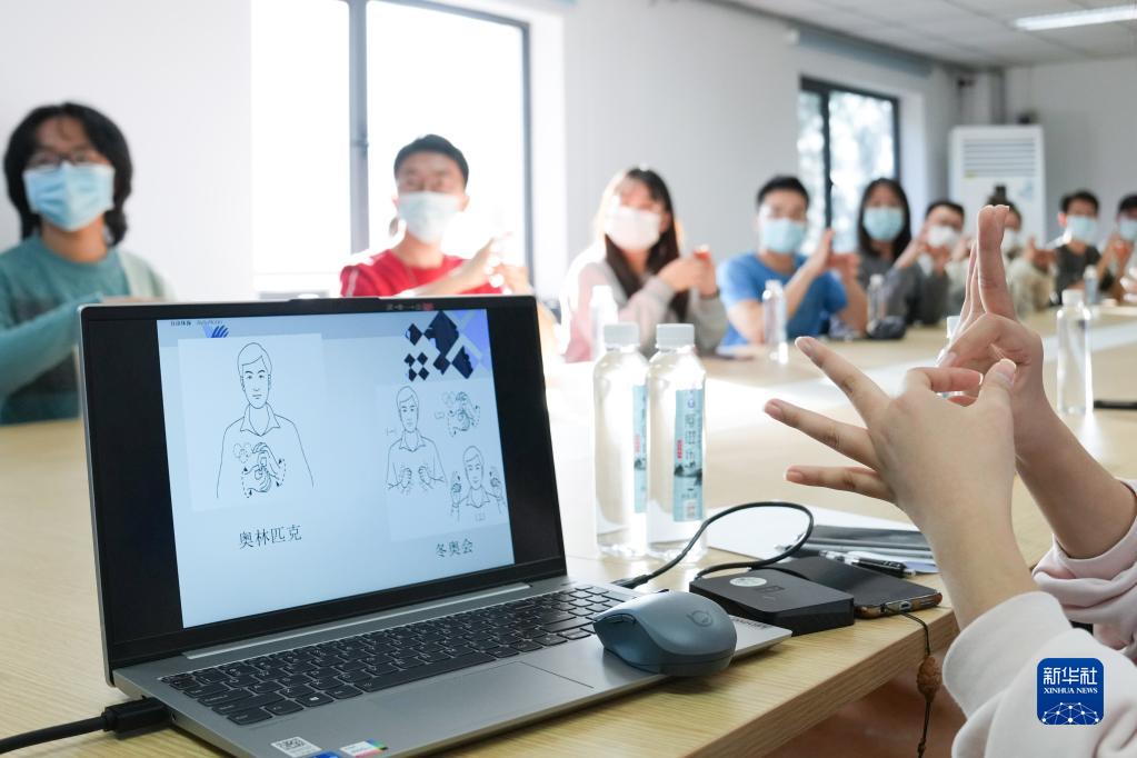 12月1日,在北京郵電大學,志愿者在培訓老師的講解下學習手語。