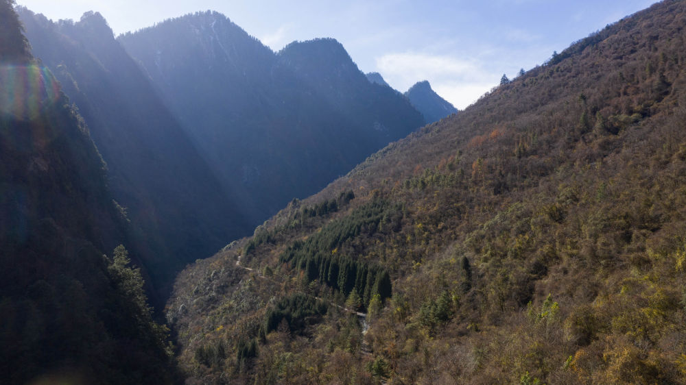 大熊貓國家公園北川小寨子溝片區(qū)群山一角(2021年11月23日無人機(jī)攝)。 新華社記者 江宏景 攝