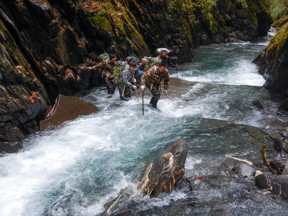 大熊貓國家公園北川小寨子溝片區(qū)的巡護(hù)隊員們在野外跋山涉水(2018年11月10日攝)。 新華社發(fā)