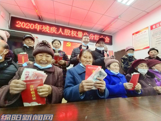桑棗鎮(zhèn)花廟村的20戶建檔立卡貧困殘疾戶代表領(lǐng)到分紅款