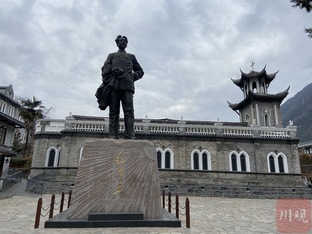 磨西鎮(zhèn)上,有一座中西合璧的天主教堂,1935年5月29日晚,經(jīng)過連續(xù)三天行軍的毛澤東隨軍團隊伍到達磨西,宿營磨西天主教堂神甫樓。