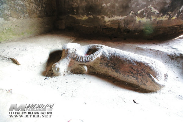 沿著綿江公路前往前進村,記者找到了名為三牛石的地方,但不見石牛蹤跡。到村委會打聽后,沿著涪江邊的龍西堰前行約一公里,在涪江邊一座簡易的房屋看到了刻在地面上的一頭石牛。