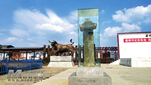 在小橋村廣場另一側(cè),一塊被玻璃保護起來的方形石碑和旁邊豎立的金色牛王非常引人注目,這座石碑就是“牛王祀田碑記”。這塊石碑過去深埋地下,2007年在進行廣場施工時才被發(fā)現(xiàn),從此,二百多年前當(dāng)?shù)丶漓肱M醯膫鹘y(tǒng)民俗活動被后人所知,并延續(xù)了下來。