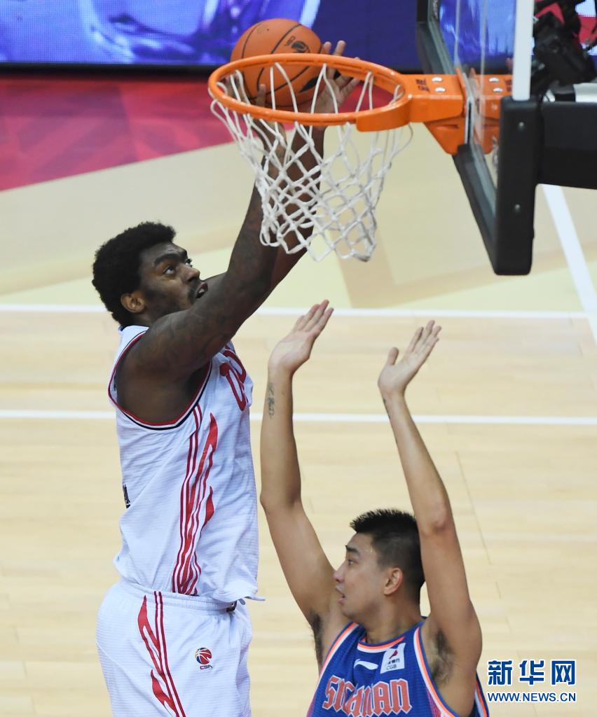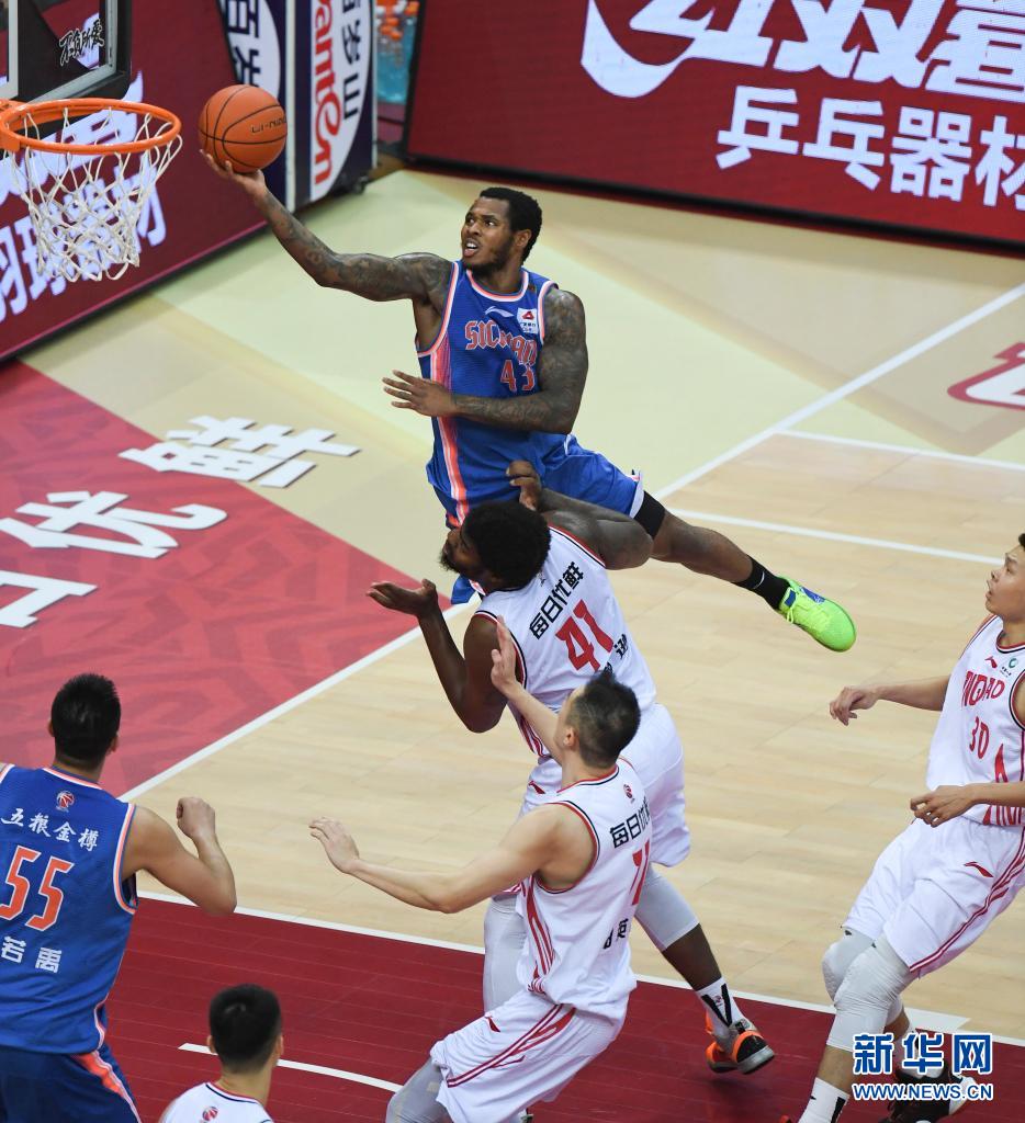 4月17日,四川五糧金樽隊球員亨特(上)在比賽中上籃。