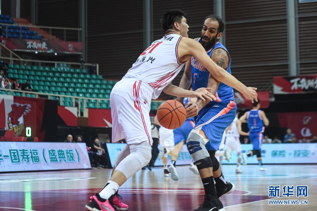 4月17日,四川五糧金樽隊球員哈達迪(右)在比賽中與青島每日優(yōu)鮮隊球員劉傳興拼搶。