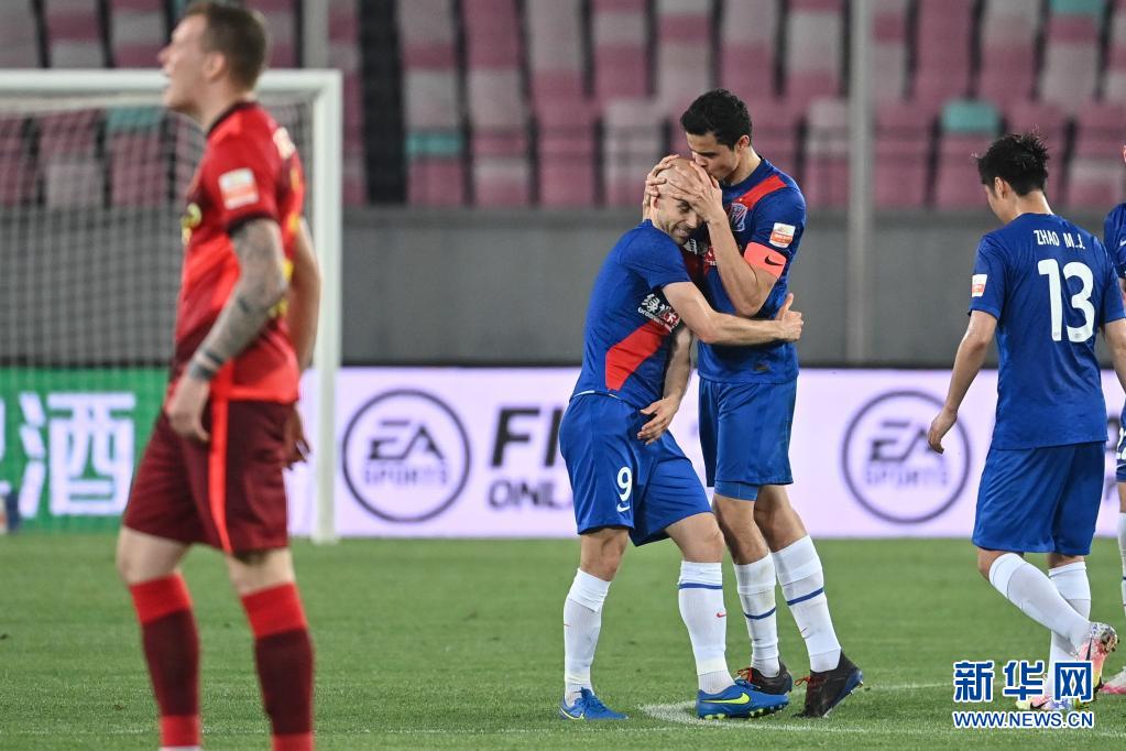 5月10日,上海申花隊(duì)球員阿德里安(左二)在比賽中和隊(duì)友莫雷諾慶祝進(jìn)球。
