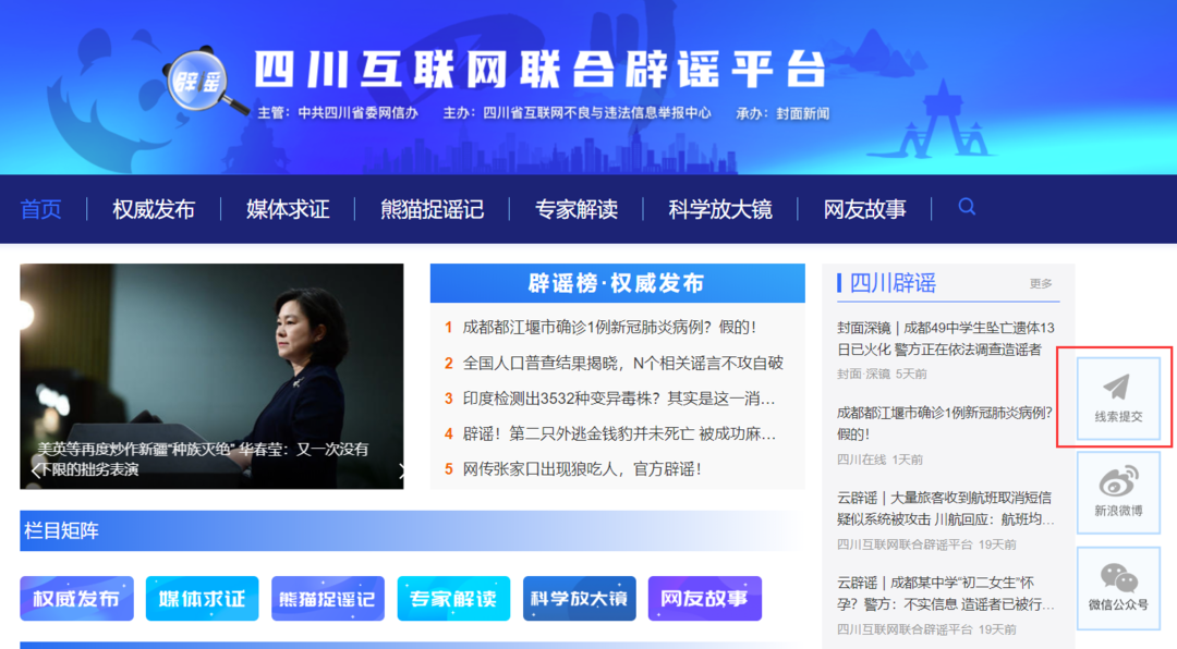 如今,四川互聯(lián)網(wǎng)聯(lián)合辟謠平臺(tái)擁有網(wǎng)站、客戶端、微博賬號(hào)、微信公眾號(hào)等多個(gè)端口,全方位提供辟謠信息服務(wù)。通過這個(gè)平臺(tái),不僅能夠看到重要辟謠信息滾動(dòng)播放,還能搜索關(guān)鍵詞求證信息真?zhèn)危瑫r(shí),通過“線索提交”按鈕,就能實(shí)現(xiàn)在線舉報(bào)謠言。