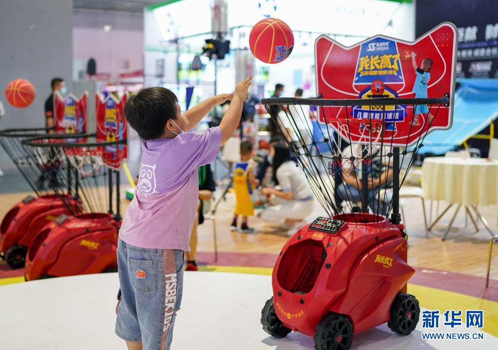5月19日,小朋友在博覽會(huì)現(xiàn)場體驗(yàn)一款籃球設(shè)備。
