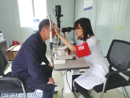 醫(yī)務(wù)人員為工人進行眼部健康檢查