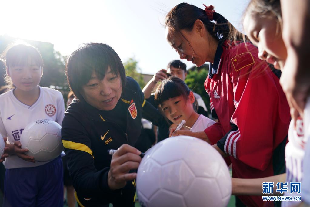 5月20日,中國足協(xié)副主席孫雯(左二)與前中國女足隊(duì)員王麗平(右二)在西安市蓮湖區(qū)遠(yuǎn)東實(shí)驗(yàn)小學(xué)為小球員簽名。