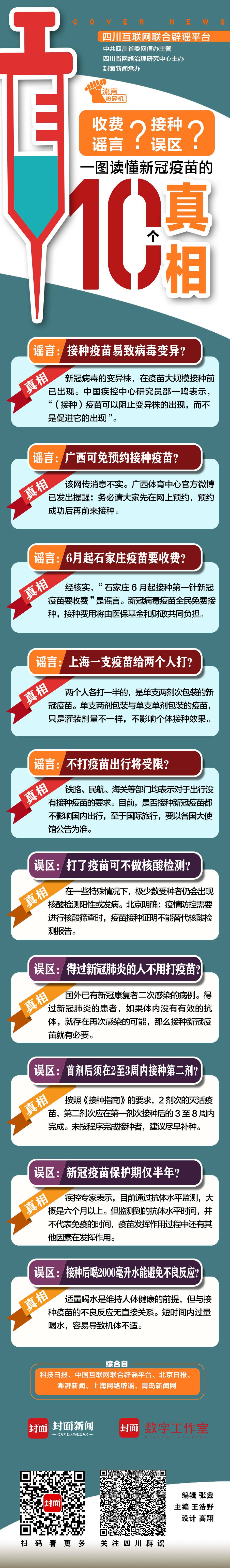 國(guó)家衛(wèi)健委19日通報(bào),全國(guó)新冠病毒疫苗接種已超4.4億劑次。目前,新冠疫苗接種工作正在有序推進(jìn)當(dāng)中,與此同時(shí),一些“小道消息”也通過(guò)社交平臺(tái)廣泛流傳,引起市民猜測(cè)和恐慌。四川互聯(lián)網(wǎng)聯(lián)合辟謠平臺(tái)盤點(diǎn)新冠疫苗的相關(guān)謠言和誤區(qū),為大家打消疑慮。