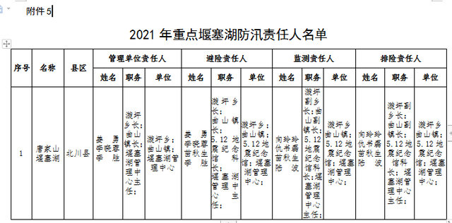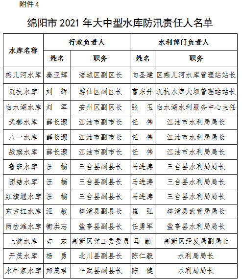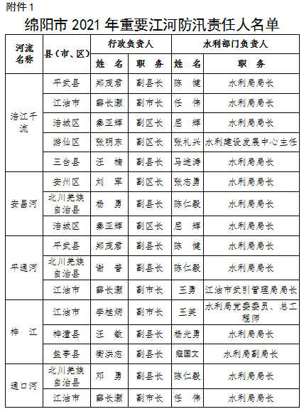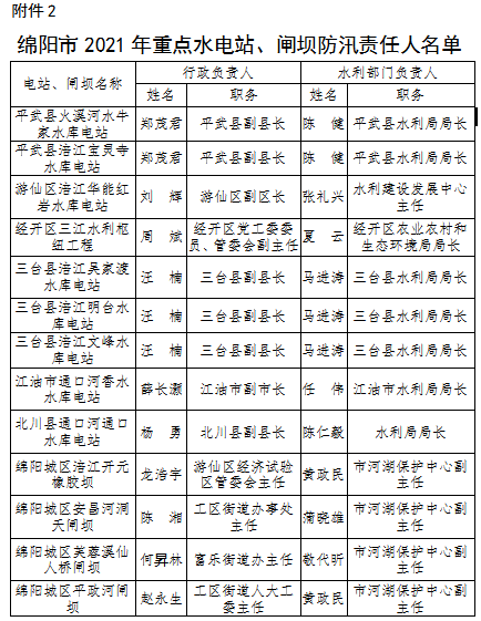 為全面壓緊壓實(shí)防汛抗旱工作責(zé)任,扎實(shí)做好2021年防汛抗旱減災(zāi)工作,根據(jù)《中華人民共和國(guó)防洪法》《四川省〈中華人民共和國(guó)防洪法〉實(shí)施辦法》等法律法規(guī)規(guī)定,現(xiàn)將我市重點(diǎn)江河、水電站、閘壩、重點(diǎn)城市、大中型水庫(kù)、重點(diǎn)堰塞湖、山洪危險(xiǎn)區(qū)(受威脅人口在1000-2000人)等防汛責(zé)任人和抗旱責(zé)任人名單予以公告。防汛責(zé)任人因工作調(diào)整變更的,由后任自動(dòng)接替,不再另行公告。