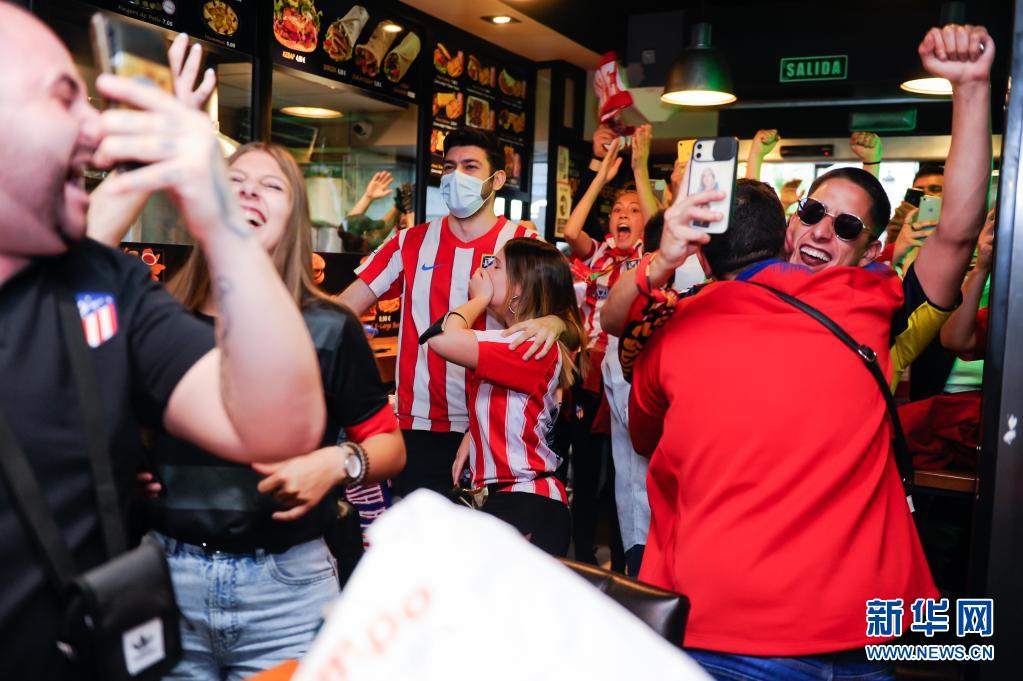5月22日,馬德里競技隊(duì)球迷在馬德里一家酒吧內(nèi)慶祝球隊(duì)奪冠。