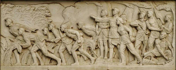 今天人們眼中所見的人民英雄紀念碑既莊嚴又不失華美,碑身挺拔,下層小須彌座鑲嵌八幅漢白玉浮雕,分別記錄著“虎門銷煙”、“金田起義”、“武昌起義”、“五四運動”、“五卅運動”、“南昌起義”、“抗日游擊戰(zhàn)爭”、“勝利渡長江,解放全中國”,這些具有標志性意義的歷史大事件,生動地反映了從鴉片戰(zhàn)爭到解放戰(zhàn)爭中國人民反帝反封建的革命歷史。浮雕上塑造的172個人物形象中,沒有一個歷史名人。為何會如此?只因“歷史是人民創(chuàng)造的,人民是歷史真正的主人”這一理念不斷強化,表現(xiàn)群體而不是表現(xiàn)個體成為共識。