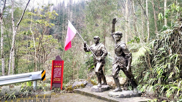 從村委會(huì)出發(fā),沿途可見“當(dāng)紅軍光榮”等標(biāo)語,“不怕犧牲、前赴后繼、勇往直前”等紅軍精神大字也隨處可見。在蜿蜒陡峭的坡道彎處,還立有“籌運(yùn)軍糧、積極參戰(zhàn)、三軍會(huì)師、不菲成果”等主題雕塑。