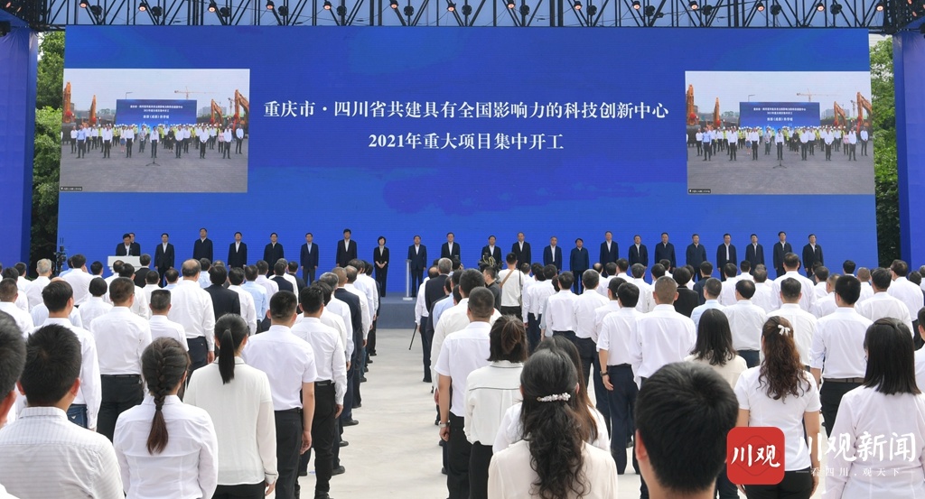 會(huì)議結(jié)束后,重慶市·四川省共建具有全國(guó)影響力的科技創(chuàng)新中心2021年重大項(xiàng)目舉行集中開工。陳敏爾、彭清華、唐良智、黃強(qiáng)等出席,通過視頻連線方式,聽取重慶兩江新區(qū)、西部(成都)科學(xué)城、西部(重慶)科學(xué)城、中國(guó)(綿陽(yáng))科技城負(fù)責(zé)同志匯報(bào)開工項(xiàng)目準(zhǔn)備情況。在熱烈掌聲中,陳敏爾、彭清華、唐良智、黃強(qiáng)共同啟動(dòng)開工裝置,標(biāo)志著總投資超過1000億元的40個(gè)重大項(xiàng)目正式建設(shè)。
