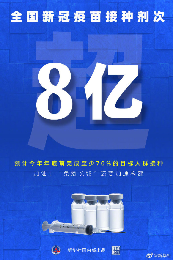 國家衛(wèi)健委6月9日通報,全國新冠疫苗接種已超過8億劑次,免疫屏障正在加速構(gòu)建。國家衛(wèi)健委負責(zé)人近日接受新華社記者專訪時表示,預(yù)計年底前至少70%目標(biāo)人群接種疫苗。共筑“免疫長城”,我們還要繼續(xù)努力。(徐鵬航、陳席元;海報設(shè)計張晨光) ????