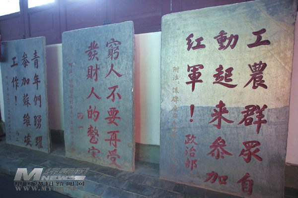 《綿陽(yáng)紅軍石刻碑林》中介紹,紅軍在綿陽(yáng)期間,大力開(kāi)展政治宣傳工作。其中,用石刻標(biāo)語(yǔ)進(jìn)行宣傳是紅四方面軍的一大創(chuàng)舉。紅軍鏨字隊(duì)和各地蘇維埃政府組織的石工,按照紅軍規(guī)定的宣傳內(nèi)容,在涪江兩岸廣大赤區(qū)的城鎮(zhèn)鄉(xiāng)村、住宅院落、交通要道、關(guān)津渡口、橋梁、懸崖絕壁處,鏨刻了大量的紅軍宣傳標(biāo)語(yǔ)。