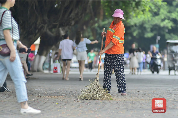 綿陽新聞網(wǎng)訊 7月5日下午3時(shí)許,在城區(qū)衛(wèi)生巷,57歲的環(huán)衛(wèi)工人王金華,正與同事一起,清掃地面上的落葉。