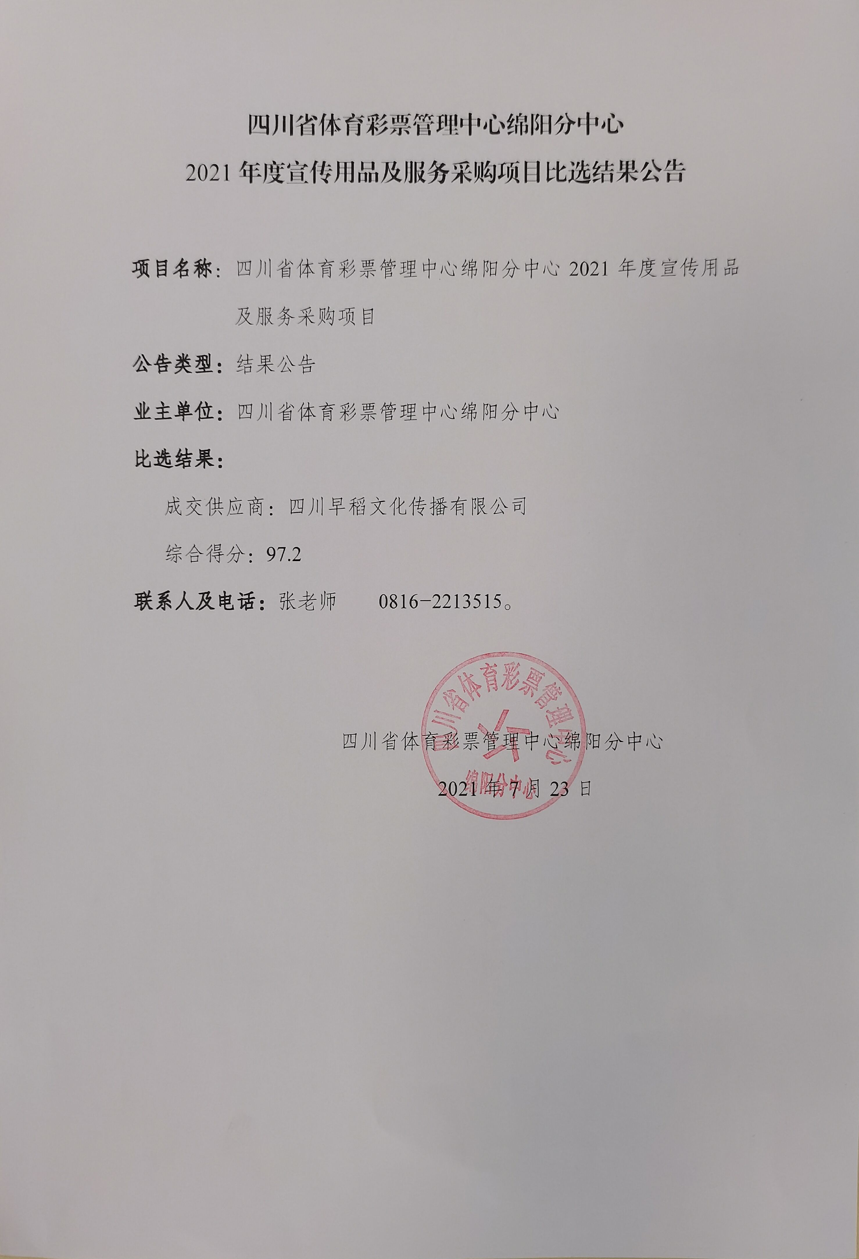 四川省體育彩票管理中心綿陽分中心2021年度宣傳用品及服務(wù)采購項(xiàng)目比選結(jié)果公告