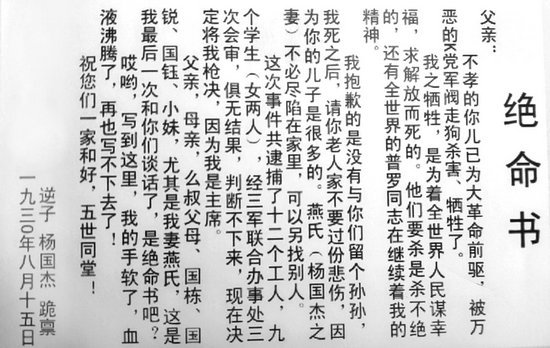 楊國(guó)杰的《絕命書》(翻拍自黨史資料)