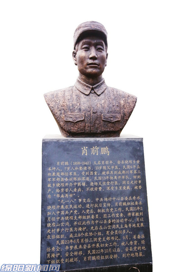 肖前鵬,1898年出生在安縣(今安州區(qū)),1931年加入中國共產(chǎn)黨,1934年到川陜蘇區(qū)加入紅四方面軍。1935年5月隨紅軍北上到安縣、北川交界的千佛山,并奉命下山籌集藥物。1942年4月,肖前鵬被地主武裝殺害,年僅44歲。
