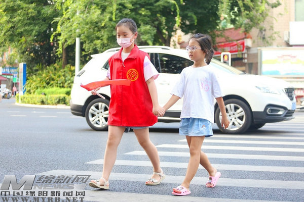 近日,在東津路與沈家壩下街交會處,10歲的小志愿者勾一然牽著小朋友過斑馬線,成為十字路口上的一道亮麗風景。