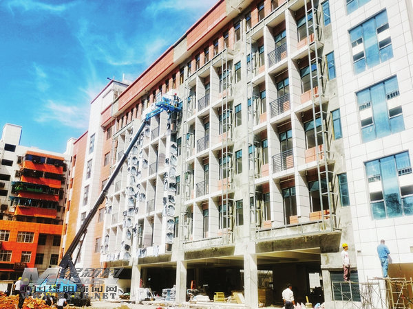 在成綿路小學(xué)改擴(kuò)建工程施工現(xiàn)場(chǎng),工人正在對(duì)外墻進(jìn)行裝飾裝修