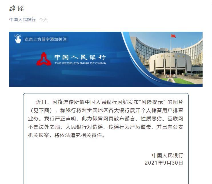 據(jù)中國(guó)人民銀行微信公眾號(hào)9月30日消息,近日,網(wǎng)絡(luò)流傳所謂中國(guó)人民銀行網(wǎng)站發(fā)布“風(fēng)險(xiǎn)提示” 的圖片(見下圖),稱我行將對(duì)全國(guó)地區(qū)各大銀行展開個(gè)人儲(chǔ)蓄用戶排查業(yè)務(wù)。我行嚴(yán)正聲明,此為假冒網(wǎng)頁散布謠言,性質(zhì)惡劣。互聯(lián)網(wǎng)不是法外之地,人民銀行對(duì)造謠、傳謠行為嚴(yán)厲譴責(zé),并已向公安機(jī)關(guān)報(bào)案,將依法追究相關(guān)責(zé)任。