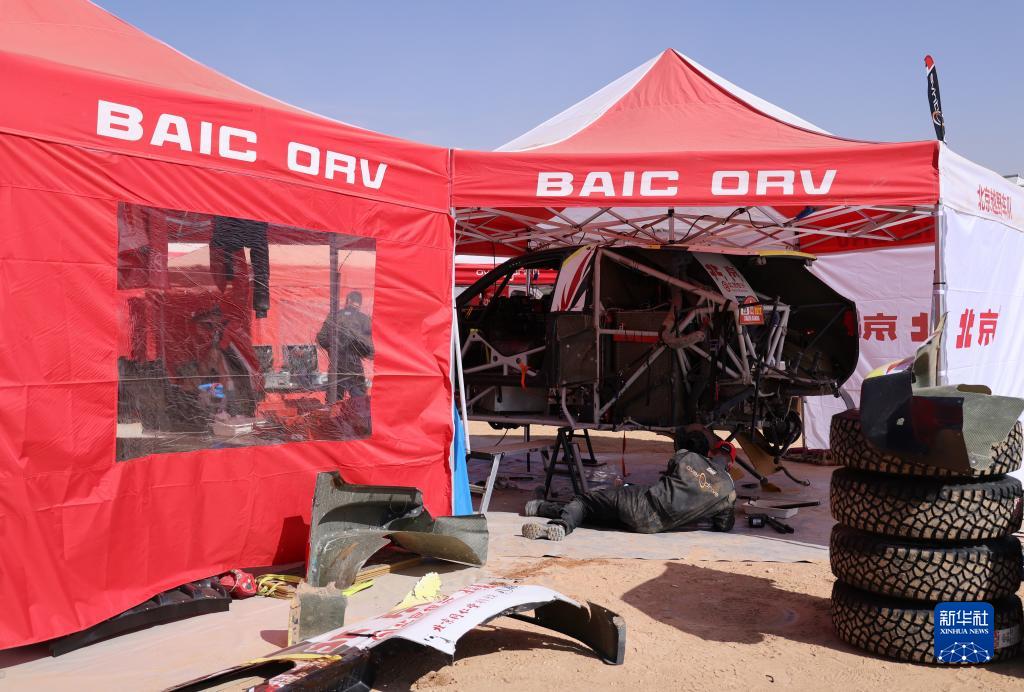1月8日,北京越野車隊技術(shù)人員在利雅得營地內(nèi)檢修車輛。
