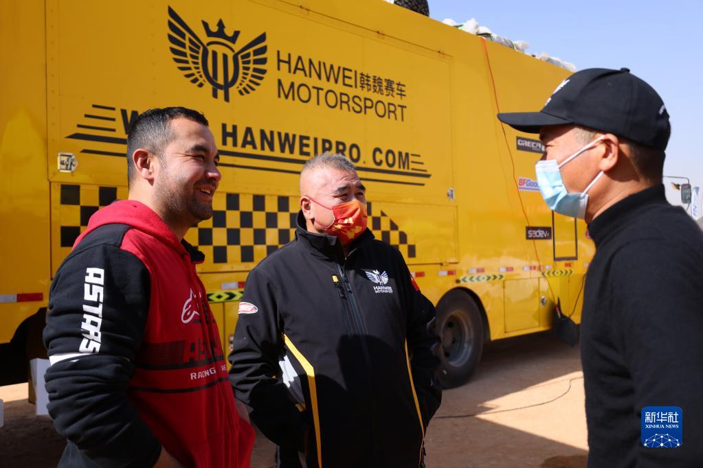 1月8日,摩托車組中國車手扎克爾·牙克甫(左)、汽車組中國車手田坡(中)、韓魏在利雅得營地交流比賽心得。