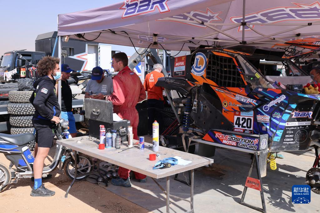 1月8日,BBR車隊技術(shù)人員在利雅得營地內(nèi)檢修車輛。