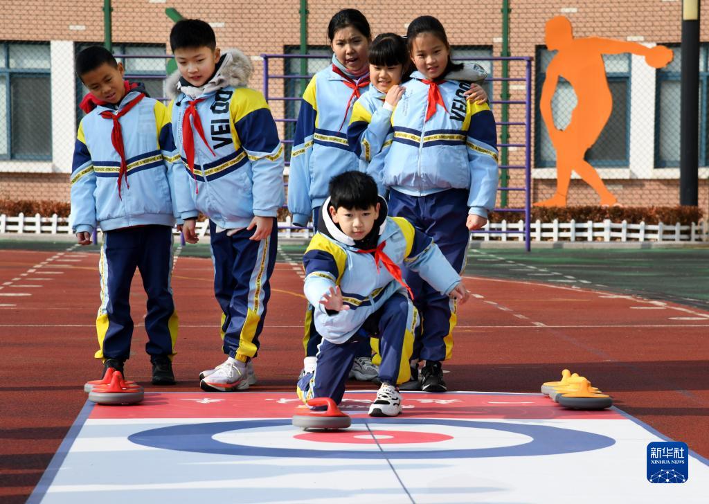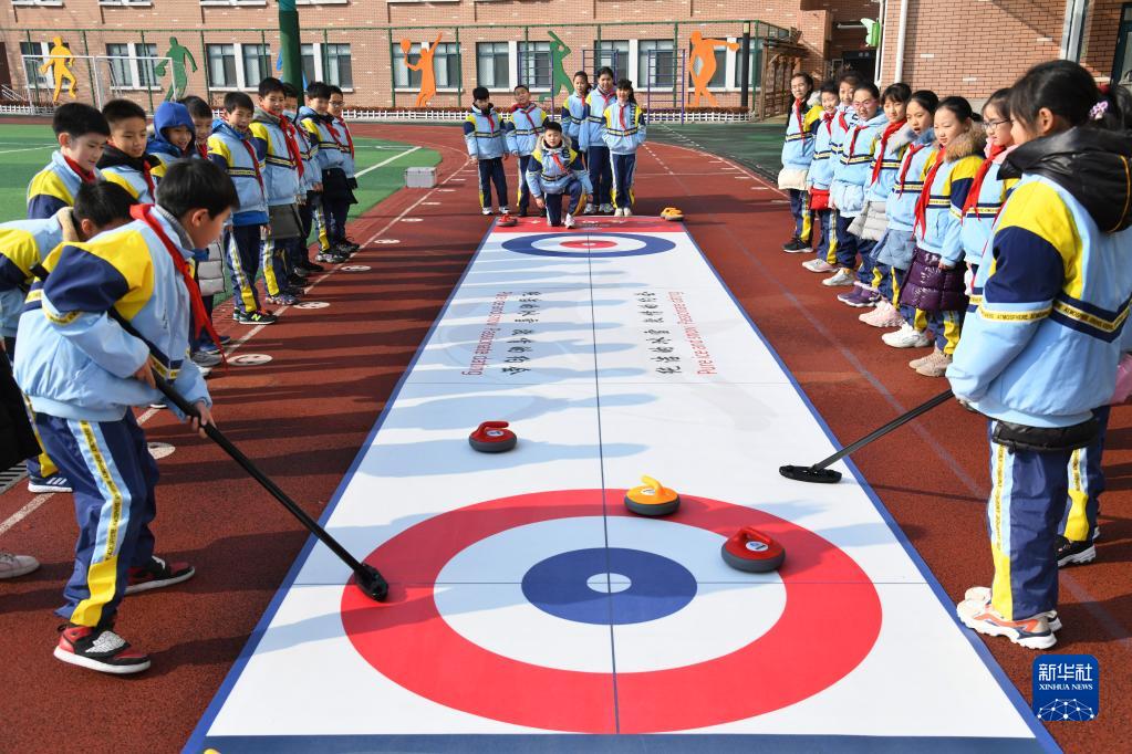 1月11日,青島市基隆路小學的同學們在體育課上練習旱地冰壺。