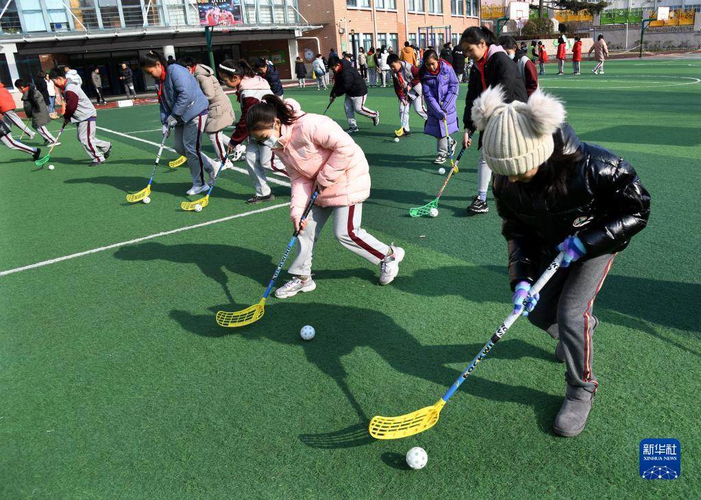 1月11日,青島市基隆路小學的同學們在體育課上練習旱地冰球。