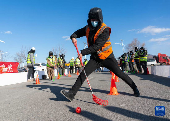 1月15日,在北京中建二局安裝公司北京冬奧會延慶賽區(qū)“海陀塔”項(xiàng)目現(xiàn)場,工地建設(shè)者們體驗(yàn)旱地冰球。