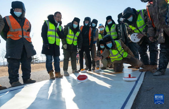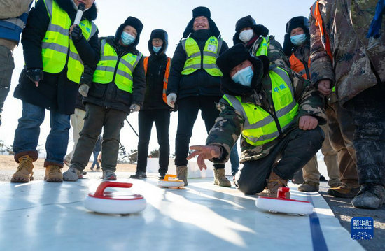 1月15日,在北京中建二局安裝公司北京冬奧會延慶賽區(qū)“海陀塔”項(xiàng)目現(xiàn)場,工地建設(shè)者們體驗(yàn)旱地冰壺。