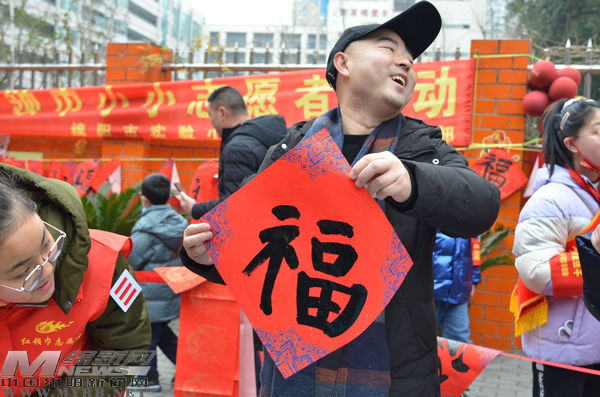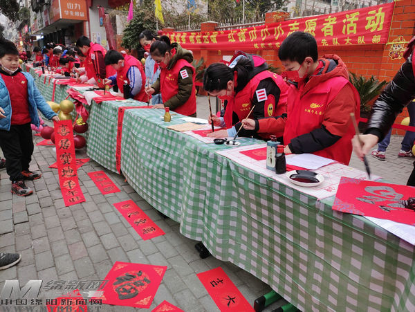當(dāng)日上午,綿陽(yáng)市涪城區(qū)南河路實(shí)驗(yàn)小學(xué)門(mén)口,實(shí)小紅領(lǐng)巾志愿者們正在聚精會(huì)神地書(shū)寫(xiě)春聯(lián),引來(lái)了不少市民圍觀和稱(chēng)贊。圍墻邊掛滿了一幅幅春聯(lián)和福字,增添了節(jié)日的喜慶。一位市民捐贈(zèng)了10元錢(qián),選擇了一副寫(xiě)有“財(cái)運(yùn)亨通全家樂(lè) 事業(yè)有成滿堂春”的春聯(lián)。她說(shuō),既體驗(yàn)到了年味,又捐了錢(qián)做了好事,感覺(jué)非常開(kāi)心。一位家長(zhǎng)說(shuō):“我家娃兒練習(xí)書(shū)法有幾年了,沒(méi)想到還能以這種方式來(lái)獻(xiàn)愛(ài)心。我們的捐款,也是對(duì)孩子學(xué)習(xí)成果的認(rèn)可,能鼓勵(lì)他們繼續(xù)學(xué)習(xí)書(shū)法。”