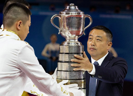 9月29日,中國乒協(xié)主席劉國梁(右)將男子團體冠軍獎杯——斯韋思林杯放在展臺上。新華社記者 江宏景 攝