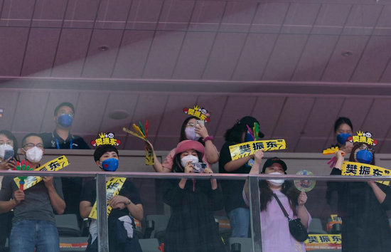 10月8日,現場觀眾為中國隊選手樊振東加油助威。新華社記者 江宏景 攝