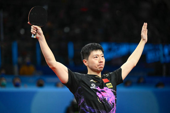 10月9日,中國隊選手馬龍在比賽中慶祝勝利,他以3比1戰(zhàn)勝德國隊選手邱黨。新華社記者 劉續(xù) 攝