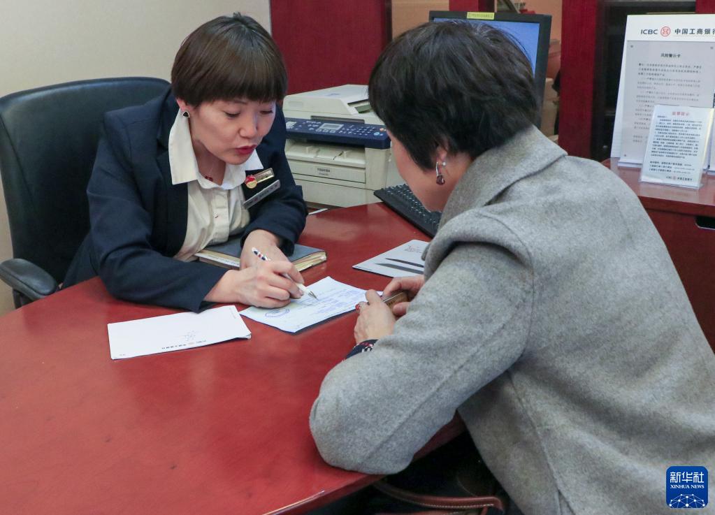 在中國(guó)工商銀行新疆烏魯木齊的一處營(yíng)業(yè)網(wǎng)點(diǎn),李鵬(左)為客戶解答問(wèn)題(2018年11月攝)。新華社發(fā)