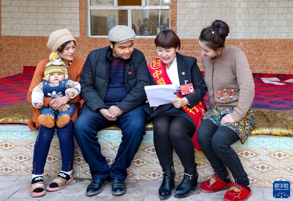 李鵬在新疆喀什地區(qū)疏勒縣塔尕爾其鄉(xiāng)塔尕爾其村向村民進(jìn)行理論宣傳(2017年12月攝)。新華社發(fā)