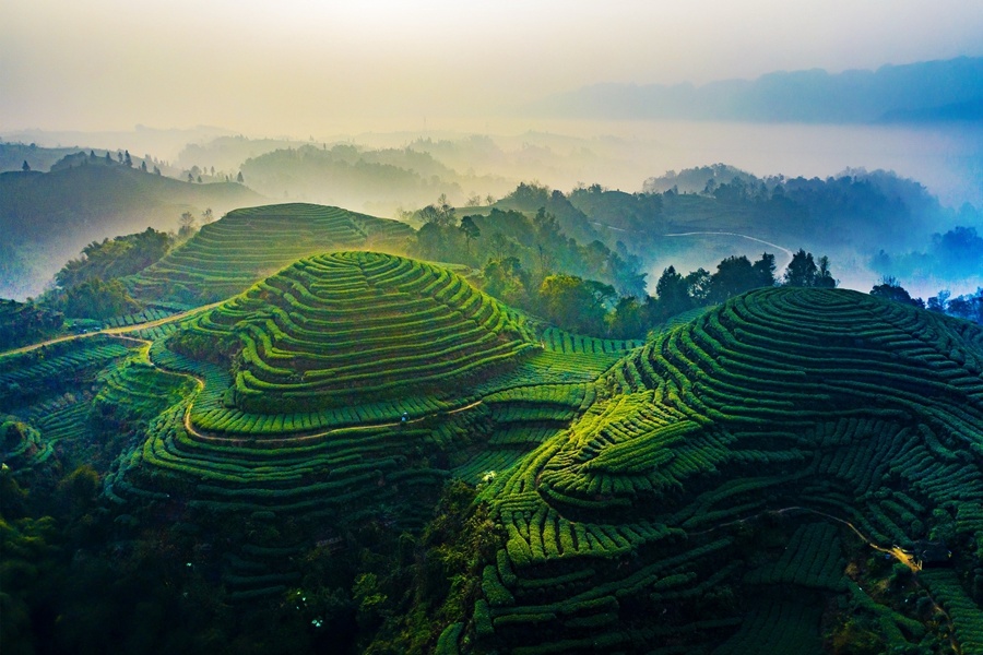 念好“優(yōu)、綠、特、強(qiáng)、新、實(shí)”六字經(jīng),大力培育川糧油、川菜、川茶等十大優(yōu)勢特色產(chǎn)業(yè),進(jìn)一步打響“川字號”品牌。圖為四川省雅安市名山茶園。