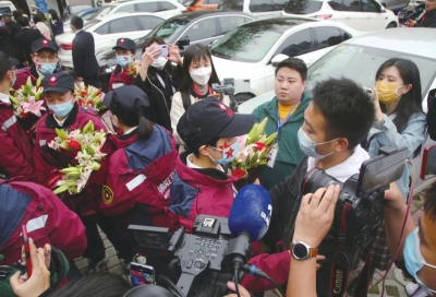 曹雨婷(右一)在援武漢醫(yī)療隊返綿采訪現場