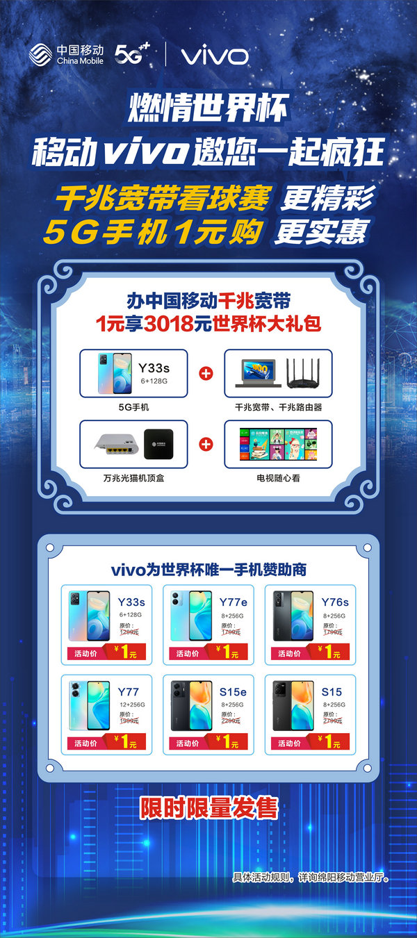 辦移動寬帶只要1元錢就可以享受價值3018元的禮包,禮包包含了vivo y33s 5G手機、千兆寬帶、千兆路由器、電視黃金會員、55G流量,用千兆、5G看球賽更精彩!